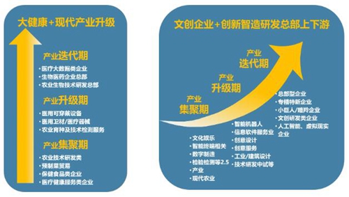產(chǎn)業(yè)方面:以“大健康”+“文創(chuàng)娛樂”+“創(chuàng)新智造”為主導產(chǎn)業(yè),科技服務和創(chuàng)意研發(fā)為輔助產(chǎn)業(yè)。