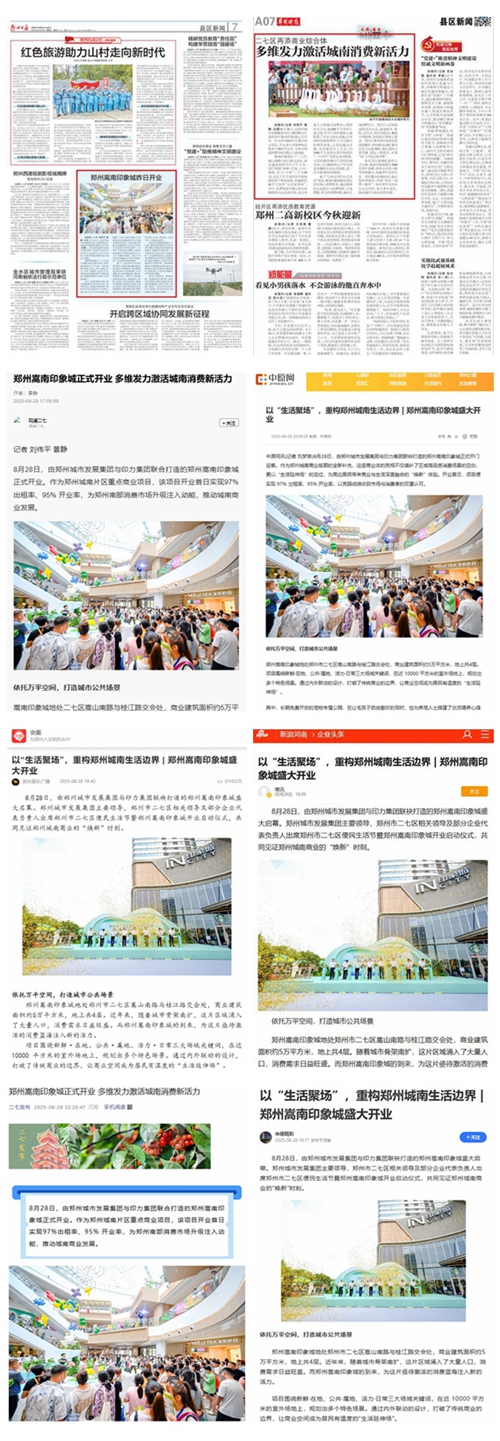 8月28日,鄭州城南商業(yè)格局迎來重大變革,由鄭州城市發(fā)展集團與印力集團攜手打造的鄭州嵩南印象城盛大啟幕,開業(yè)首日客流達12.6萬人次,迅速成為全城矚目的焦點。這一盛事引發(fā)了各大媒體的廣泛關(guān)注,河南日報客戶端、頂端新聞、大象新聞、大河報、大河網(wǎng)、映象網(wǎng)、河南經(jīng)濟報、鄭州日報、鄭州晚報、鄭州廣播電視臺等媒體紛紛聚焦,對其開業(yè)進行了全方位、多角度的報道。