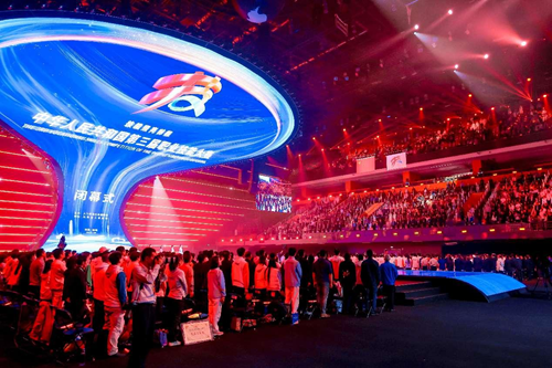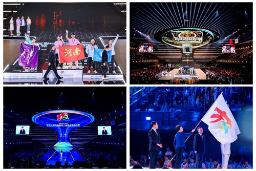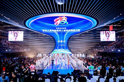 華燈璀璨,掌聲如潮。9月23日晚,當(dāng)348名獲獎(jiǎng)選手高舉隊(duì)旗與獎(jiǎng)?wù)?,?dāng)大賽會(huì)旗在璀璨的舞臺(tái)上完成交接傳遞,當(dāng)良渚文化和人形機(jī)器人在現(xiàn)場(chǎng)8000余名觀眾的歡呼聲中共舞……中華人民共和國(guó)第三屆職業(yè)技能大賽閉幕式在鄭州奧體中心體育館完美落幕!