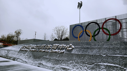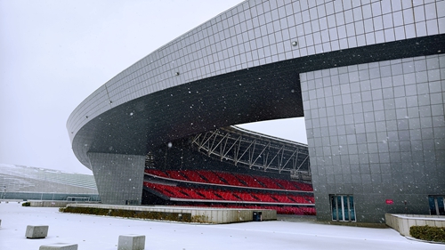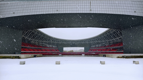 奧體中心的場館在白雪映襯下