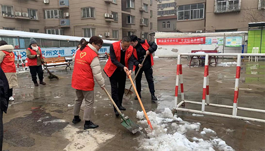 昨晚,鄭州市迎來了牛年第一場雪,小區(qū)活動場地已披上一層皚皚白雪,為方便小區(qū)居民通行,志愿者們拿著鐵鍬、掃把清理廣場上的積雪,經(jīng)過大家的努力,積雪被清理干凈。