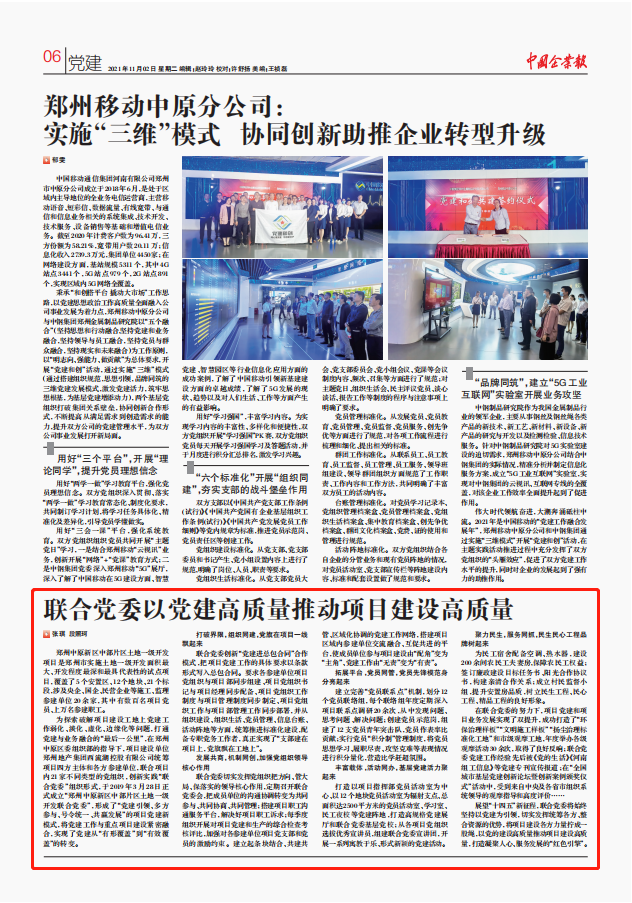 西流湖公司始終堅持“抓好黨建就是最大的政績”,創(chuàng)新“黨建進總包合同”合作模式,貫徹落實“支部建在項目上,黨旗飄在工地上”的工作思路,以中原新區(qū)中部片區(qū)土地一級開發(fā)聯(lián)合黨委和項目黨支部建設(shè)為抓手,以“12343”黨建工作體系為指引,讓黨的主張、黨的作風、黨組織的力量在項目建設(shè)中處處彰顯,充分激發(fā)黨員的先鋒模范作用和黨組織的堅強堡壘作用,將黨建轉(zhuǎn)化為生產(chǎn)力,真正實現(xiàn)黨建促發(fā)展的“紅色引擎”作用。公司黨建工作先進經(jīng)驗榮登《中國企業(yè)報》,意味著公司黨建工作先進經(jīng)驗對于全國企業(yè)黨建具有良好的借鑒意義,標志著公司黨建工作及宣傳水平再上新臺階。